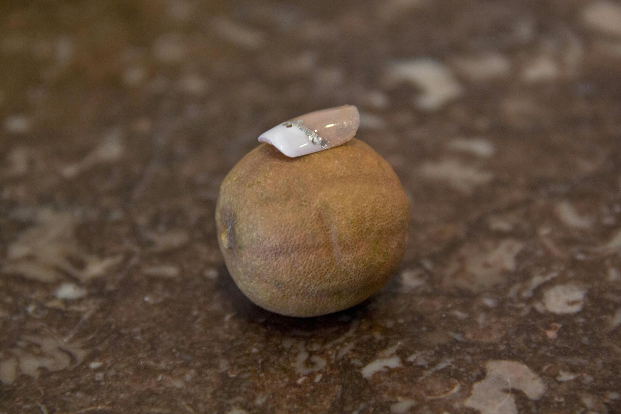 coral; coral with enamel; ceramic swan with hair from self-haircut; acrylic nail from drag queen on dehydrated lemon; moth on marble on mannequin finger; wasp nest components; metal; plastic cougar taxidermy tongue on plastic bear taxidermy tongue on gifted fabric; wax; exact replica of the moon the night we kissed in aluminum; plastic champagne glasses; marzipan; plastic; box; rock made of paper, concrete, graphite, fingernail polish, spray paint, dirt, acrylic; enamel on leaf; candy wrappers; gum on toy on pumice stone; napkin from a first date; cherry stem tied into a knot by the tongue of a stranger; frame; fingernail polish on Peachie-O; wisdom tooth of lover; copy of wisdom tooth from lover in unpolished silver; hair in jar, received as a gift; sea urchin shell; dead mistletoe; dried marshmallow Peeps; wisdom tooth from lover on acrylic box; candy; paper; stolen tchotchke; coral; wig stand from woman who died just before we could meet; clown nose from a clown crush; owl tchotchke; owl tchotchke; plastic rock; iron rock